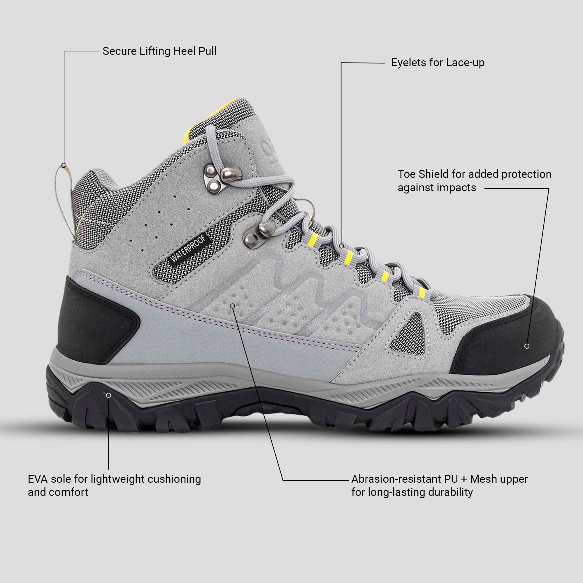 Conquer every trail with Ozark Men's Outdoor Hiking Shoes - built for endurance, grip, and all-day comfort. Designed with a tough PU + Mesh upper and breathable mesh lining, these shoes offer flexibility and ventilation for outdoor performance. The EVA + Rubber sole ensures firm traction on uneven terrains, while the cushioned EVA moulded footbed provides superior support and comfort through long hikes and outdoor expeditions.