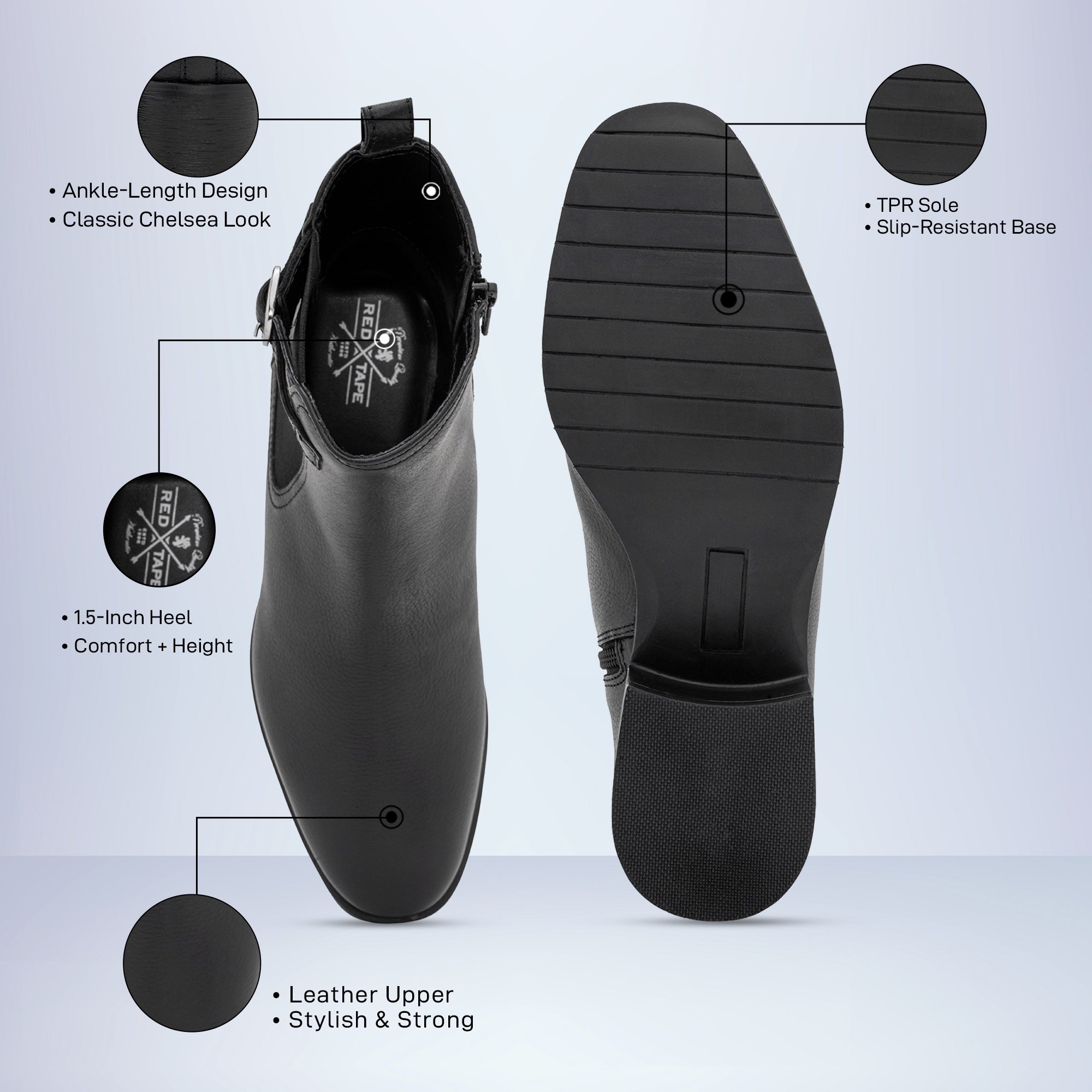 Step out in timeless confidence with these Red Tape women's leather Chelsea boots, crafted for style, comfort, and durability. Made with a genuine leather upper, cushioned high-density foam insole, and a sturdy TPR sole, these ankle-length boots blend classic design with modern ease. The zipper closure ensures a snug fit, while the 1.5-inch heel adds subtle lift and everyday versatility - perfect for casual outings or stylish urban looks.