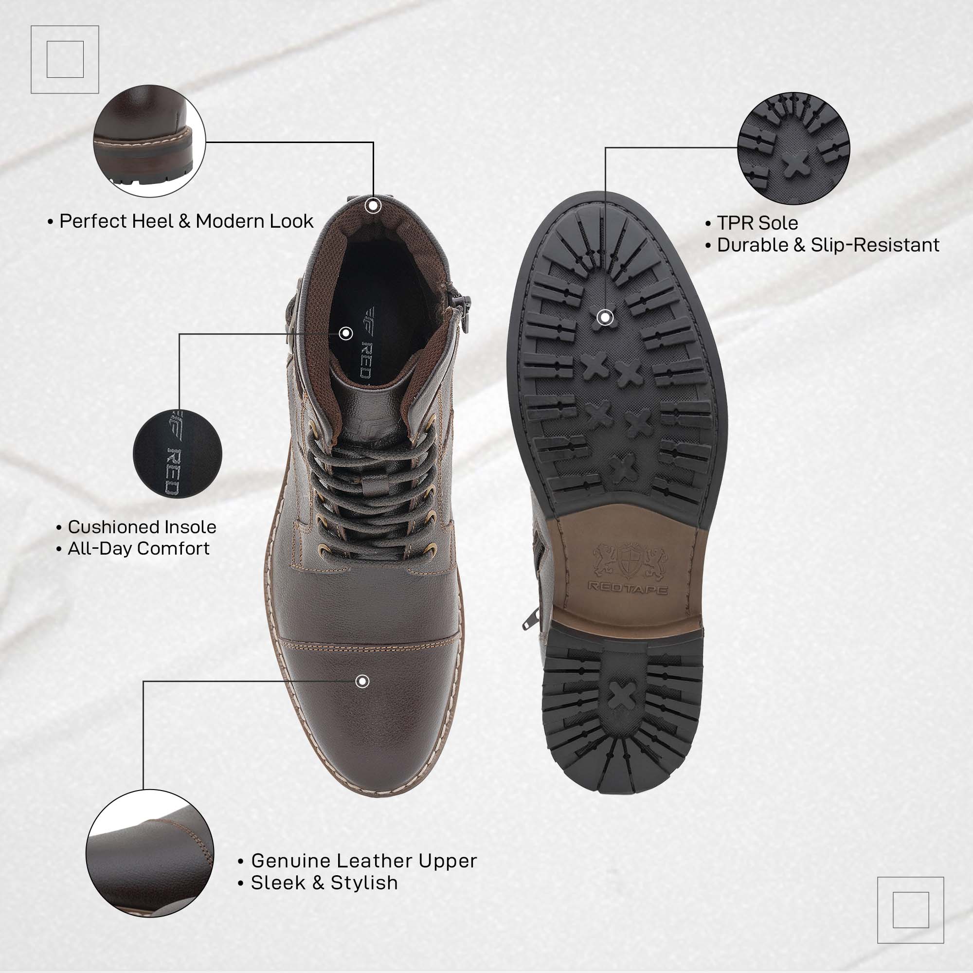 Experience a fresh and stylish new appearance with Red Tape's Casual Biker Boots for Men! These shoes feature a TPR Sole and Leather Upper, providing a polished and sophisticated look for any formal event.