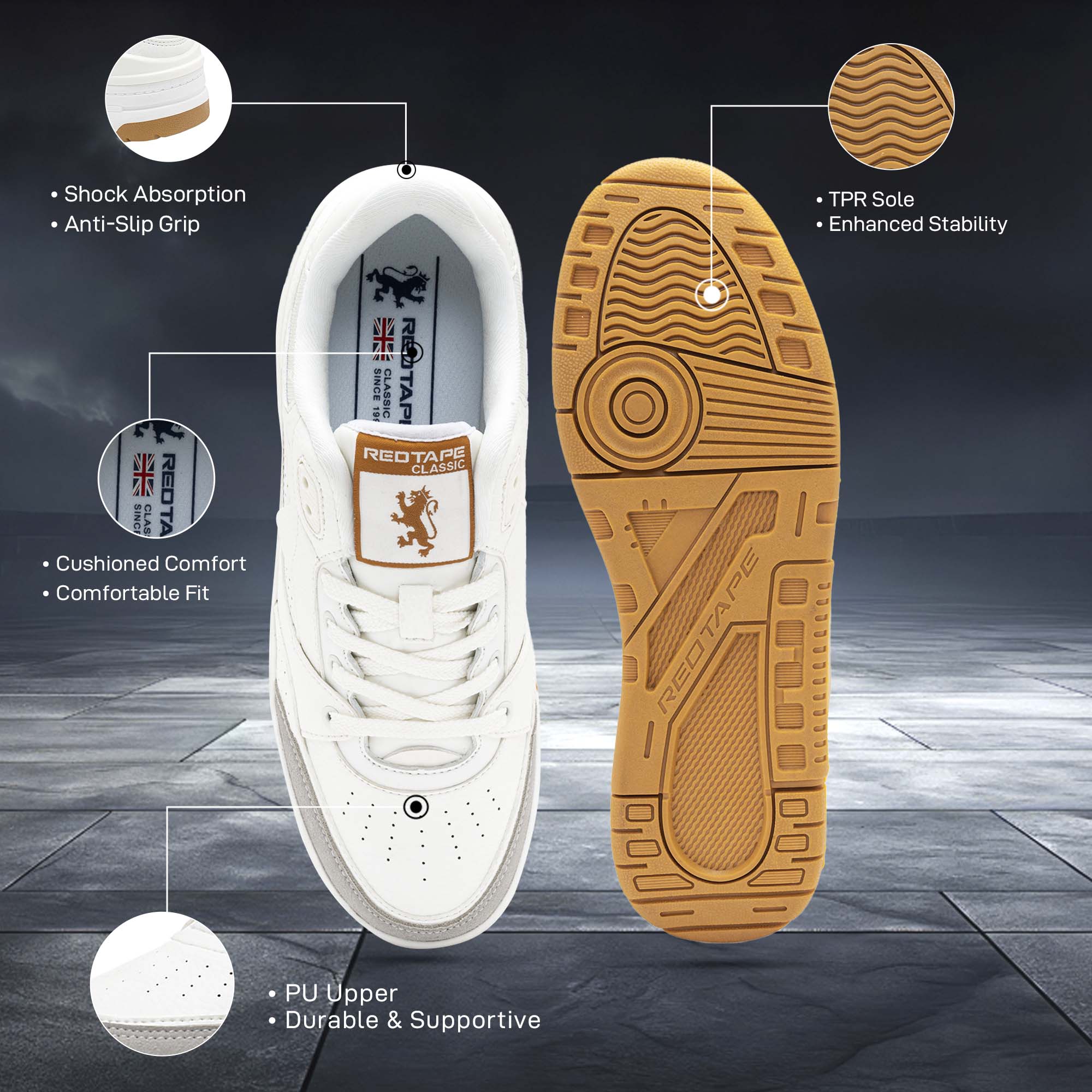 Treat yourself to a brand-new look with Red Tape's White Casual Lifestyle Shoes for Men! These shoes have a stylish TPR Sole and a low-maintenance PU Upper. These shoes are designed with a cohesive white aesthetic, incorporating different textures and pops of brown color for contrast. The Round Toe design adds a fashionable touch that will make you stand out wherever you go!
