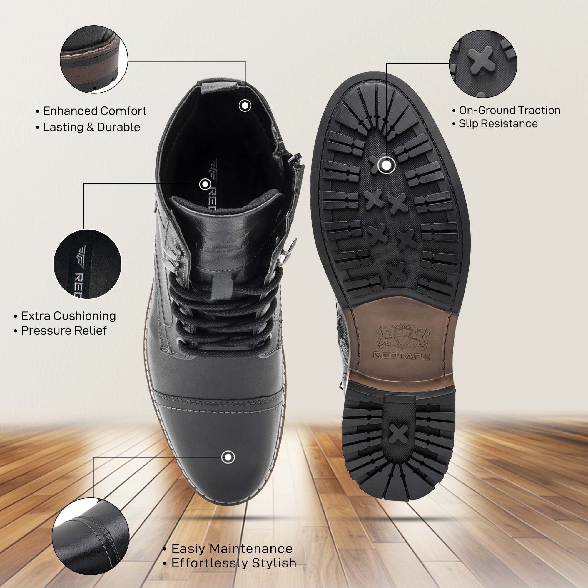 Step up your style game with Red Tape boots for men, designed to deliver both comfort and durability. Crafted with a premium leather upper and a slip-resistant TPR sole, these ankle-length boots ensure long-lasting wear and dependable performance. The lace-up closure allows for a secure fit, while the round toe shape adds timeless appeal. Perfect for everyday wear or outdoor adventures, these boots are a versatile addition to your wardrobe. Recognised as some of the best boots for men. These boots for men are trending Chelsea boots for men on sale collections.