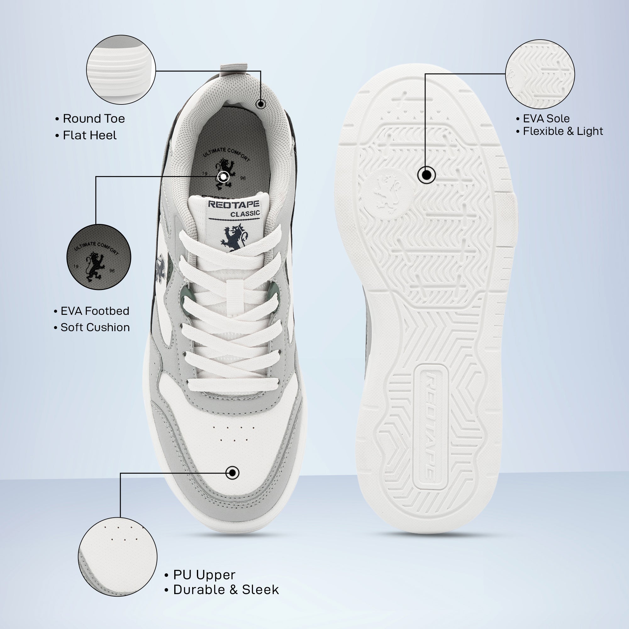 Step into easy-going style with Red Tape Men's Lifestyle Sneakers, crafted to deliver all-day comfort and versatility. The PU upper gives a smooth, premium finish, while the Mesh lining enhances breathability to keep your feet cool and relaxed. Supported by a lightweight EVA sole, these sneakers ensure flexibility, cushioned comfort, and durability for daily wear. Designed with a Classic Comfort EVA Footbed, they provide soft support that adapts to your stride. Perfect for casual outings, travel, or relaxed weekends - these sneakers combine comfort, quality, and timeless Red Tape appeal.