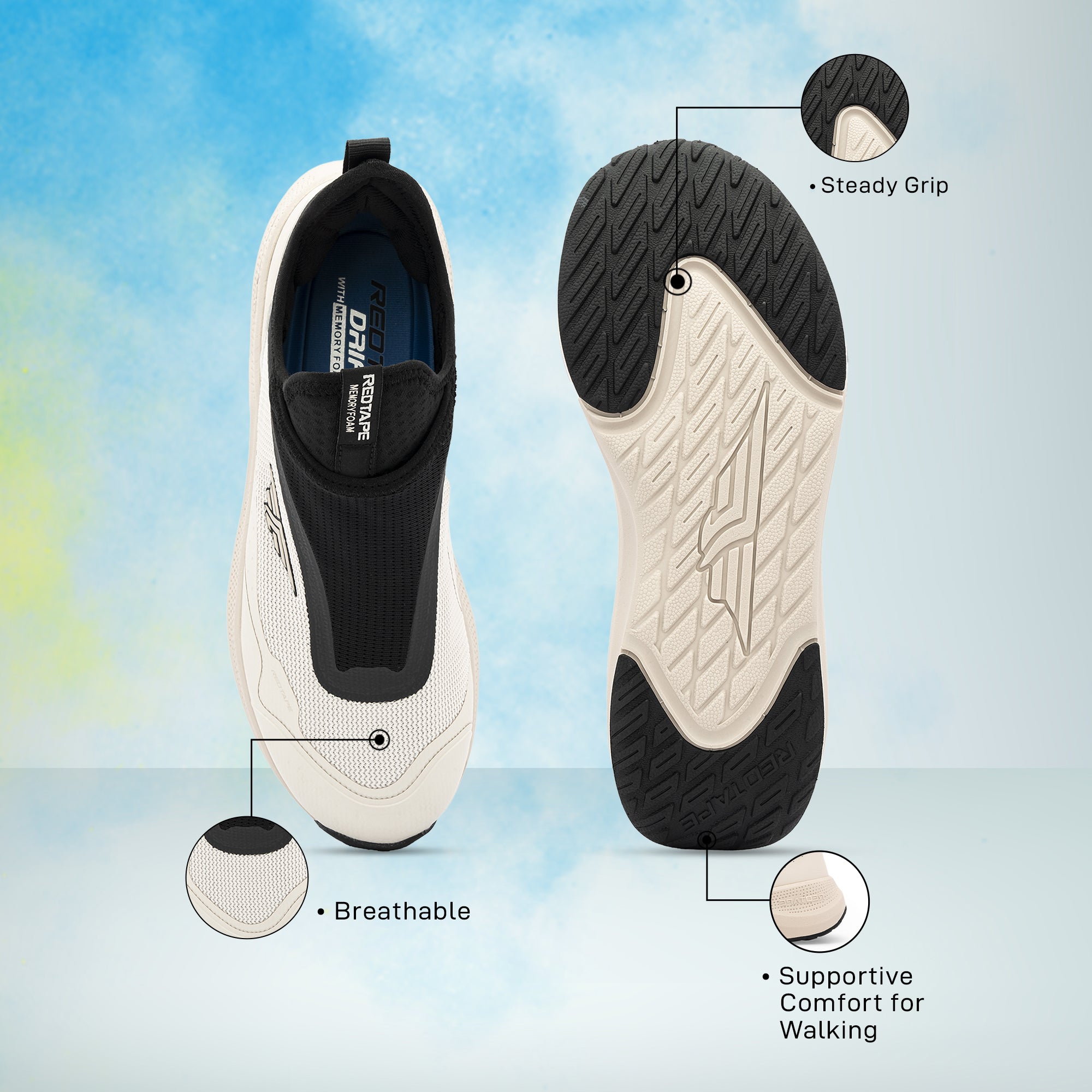 Experience effortless comfort with Red Tape Walking Slip-On Shoes for Men, designed to make every step feel light and supported. Crafted with a breathable mesh upper and soft mesh lining, these shoes offer excellent ventilation and all-day freshness. The EVA sole provides superior cushioning, shock absorption, and flexibility, while the DRIFT+ Memory Foam insole ensures plush comfort and perfect foot support. The low-cut slip-on design makes them easy to wear, ideal for walking, travel, or daily errands.